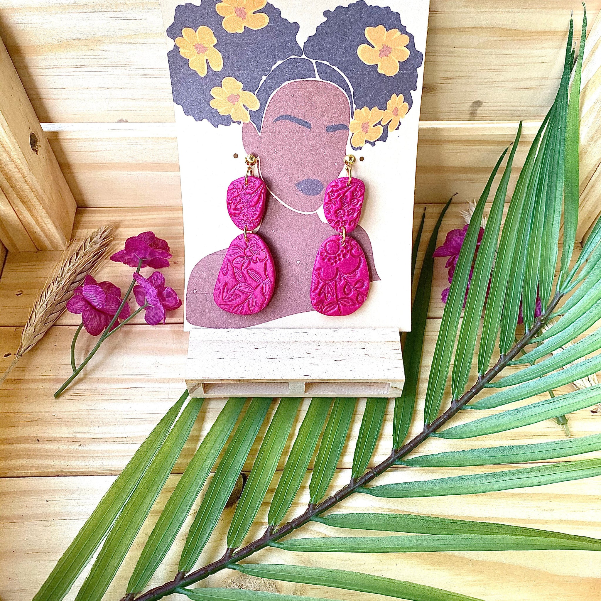 Pink Dangle Flower Textured Polymer Clay Earrings